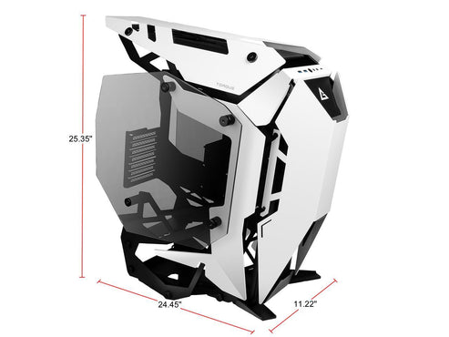 Torque Black/White, a commanding mid tower with a forward-tilted motherboard position, aggressive lines, and plenty of features designed for performance-heavy builds, merges precision cut aluminum panels in high contrast black & white color to bring an augmented experience to your desktop.