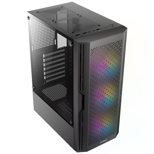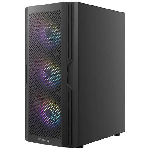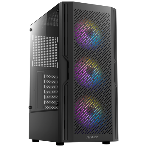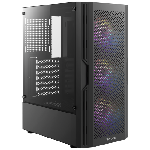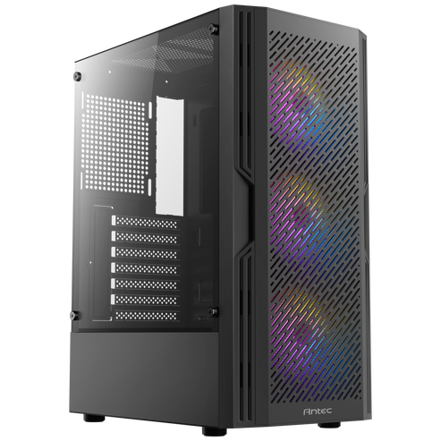 The Antec AX20 Case is a mid-tower gaming case designed for high airflow and customizable cooling. It features a slanted bar air intake design, a mesh front panel, and pre-installed 3 x 120mm RGB fans. The case supports up to 8 x 120mm fans for exceptional cooling options and includes a tempered glass side panel for showcasing your build. Its compact design ensures compatibility with ATX, Micro-ATX, and ITX motherboards.
