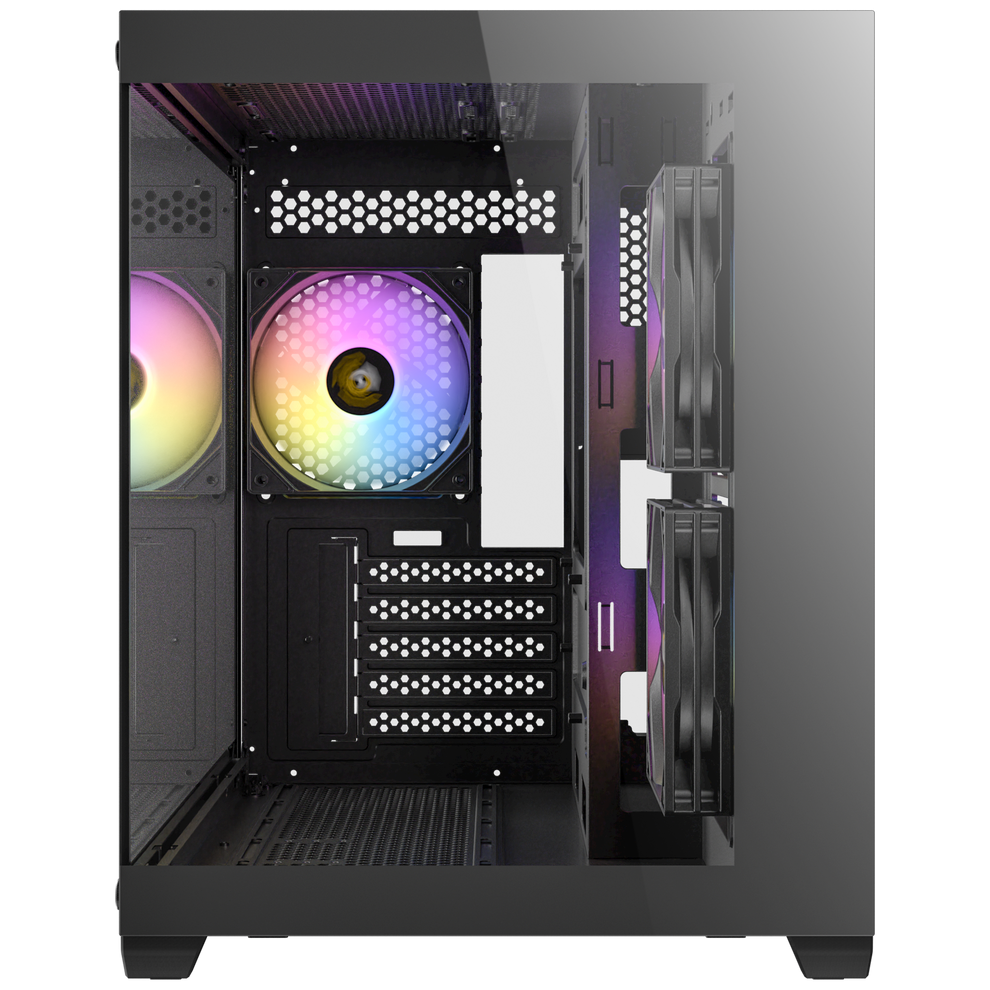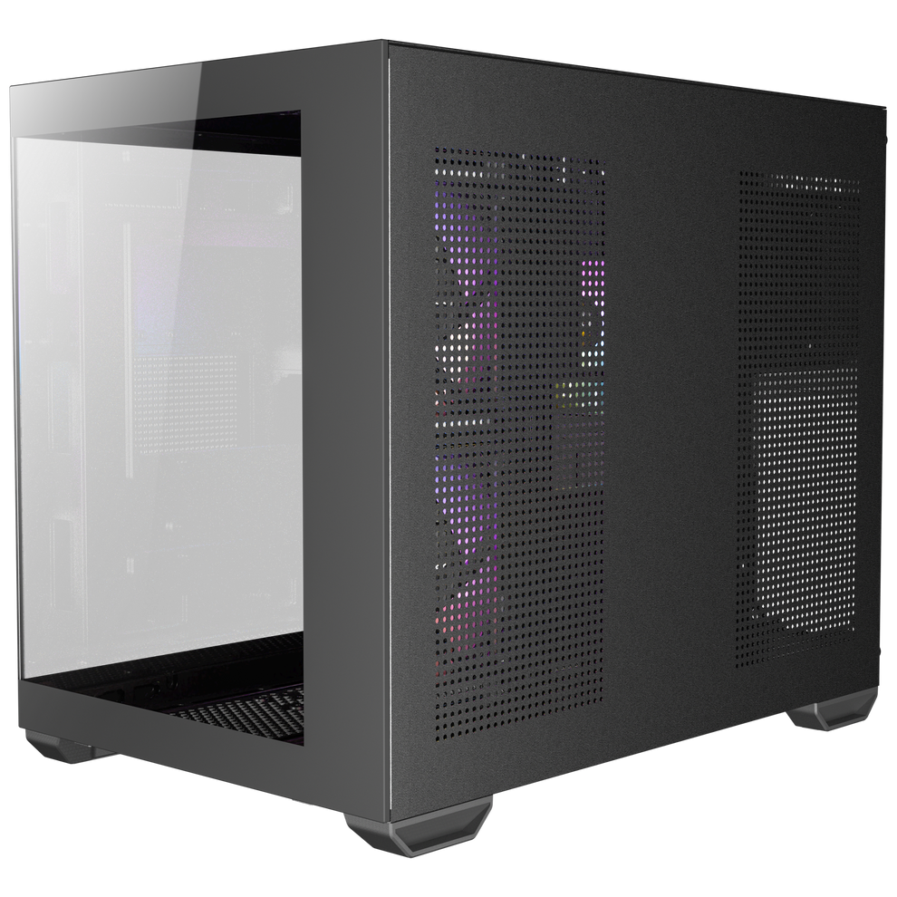 CX600M Black ARGB's seamless left and front glass panels offer an unobstructed view of your build, creating a stunning showcase for your components. Right side of front is made of wood that could be seamlessly integrated into your interior design style.