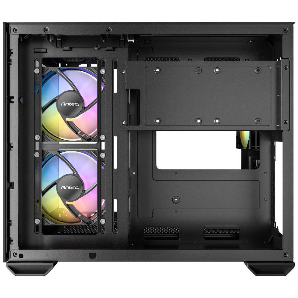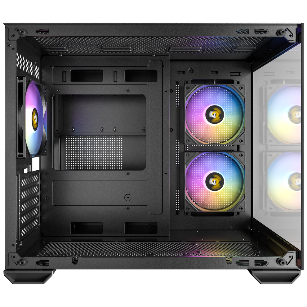 Dual chamber design ensures independent cooling for CPU/GPU on the left and PSU / Drives on the right.